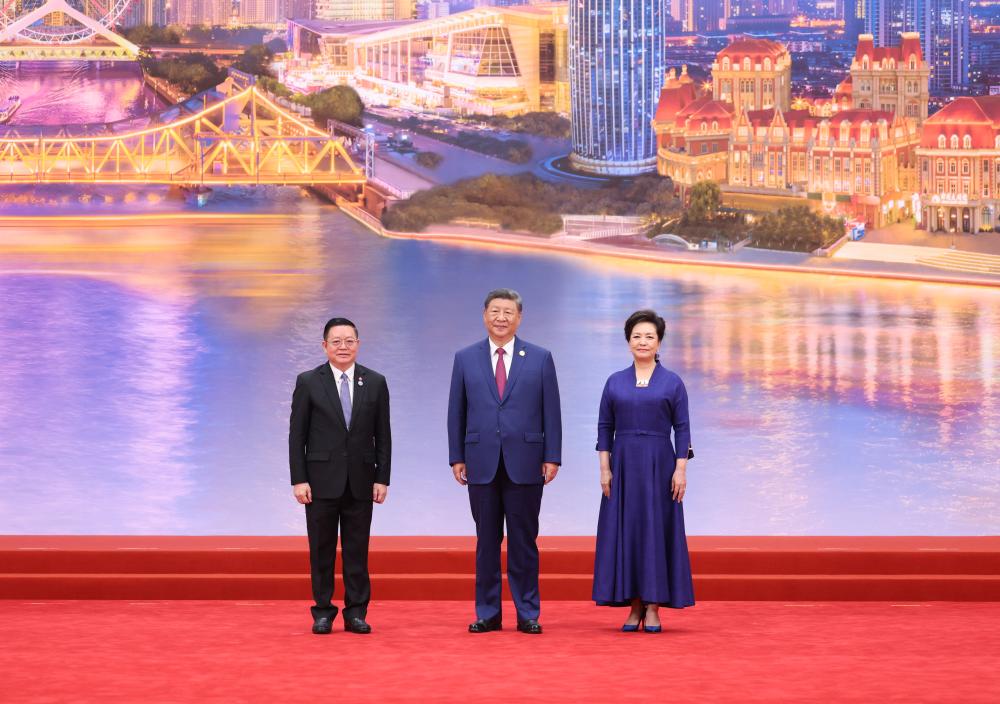 Chinese President Xi Jinping and his wife, Peng Liyuan, pose for a group photo with General Secretary of the Lao People's Revolutionary Party Central Committee and Lao President Thongloun Sisoulith at the Meijiang Convention and Exhibition Center in Tianjin, north China, Aug. 31, 2025. Xi and Peng on Sunday hosted a banquet in China's port city of Tianjin to welcome international guests who are here to attend the Shanghai Cooperation Organization (SCO) Summit 2025. (Xinhua/Ding Haitao)