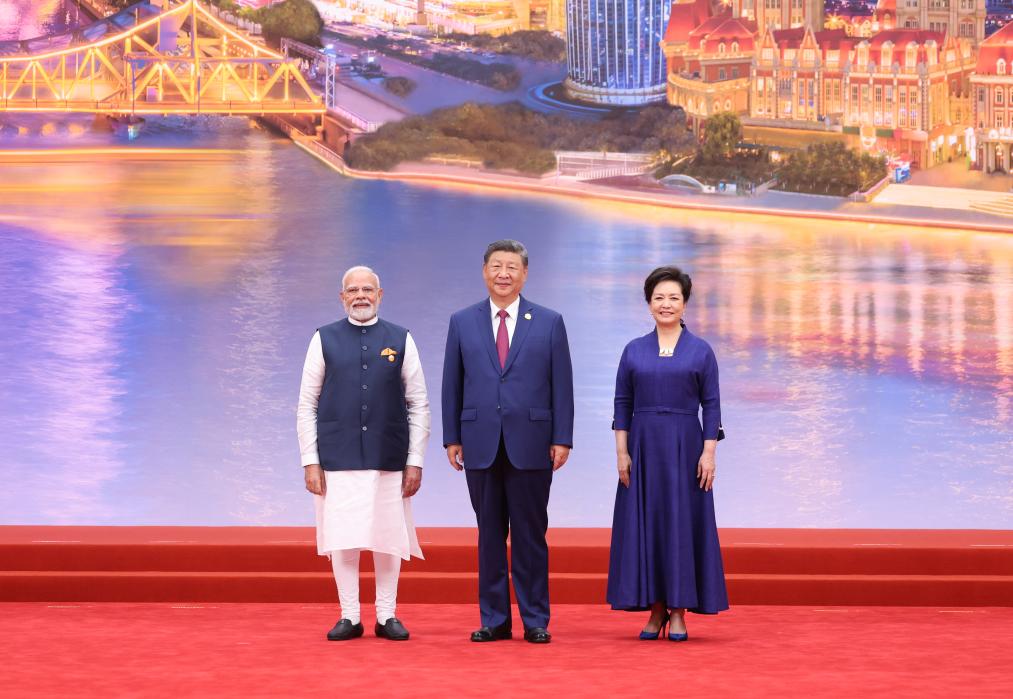 Chinese President Xi Jinping and his wife, Peng Liyuan, pose for a group photo with Indian Prime Minister Narendra Modi at the Meijiang Convention and Exhibition Center in Tianjin, north China, Aug. 31, 2025. Xi and Peng on Sunday hosted a banquet in China's port city of Tianjin to welcome international guests who are here to attend the Shanghai Cooperation Organization (SCO) Summit 2025. (Xinhua/Ding Haitao)