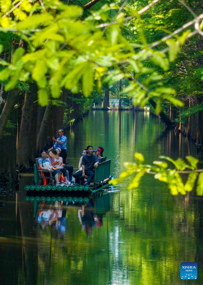 A drone photo taken on Aug. 30, 2025 shows tourists taking a bamboo raft to enjoy the scenery in a water forest scenic area in Jinhu County, east China's Jiangsu Province. (Photo by Zhou Shegen/Xinhua)