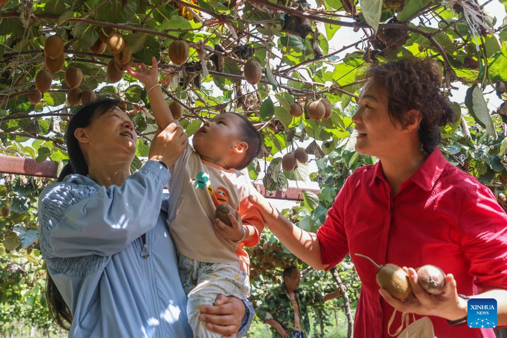 Tourists pick kiwi fruits at a plantation in Xiaozhangzhuang Village in Pingdingshan City, central China's Henan Province, Aug. 31, 2025. (Photo by He Wuchang/Xinhua)