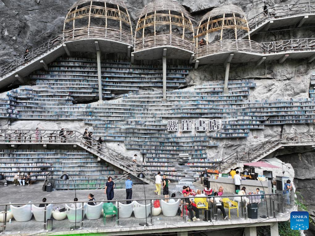 A drone photo taken on Aug. 30, 2025 shows people visiting a bookstore on the cliff at a scenic spot in Luocheng Mulao Autonomous County, Hechi City, south China's Guangxi Zhuang Autonomous Region. (Photo by Wei Rudai/Xinhua)
