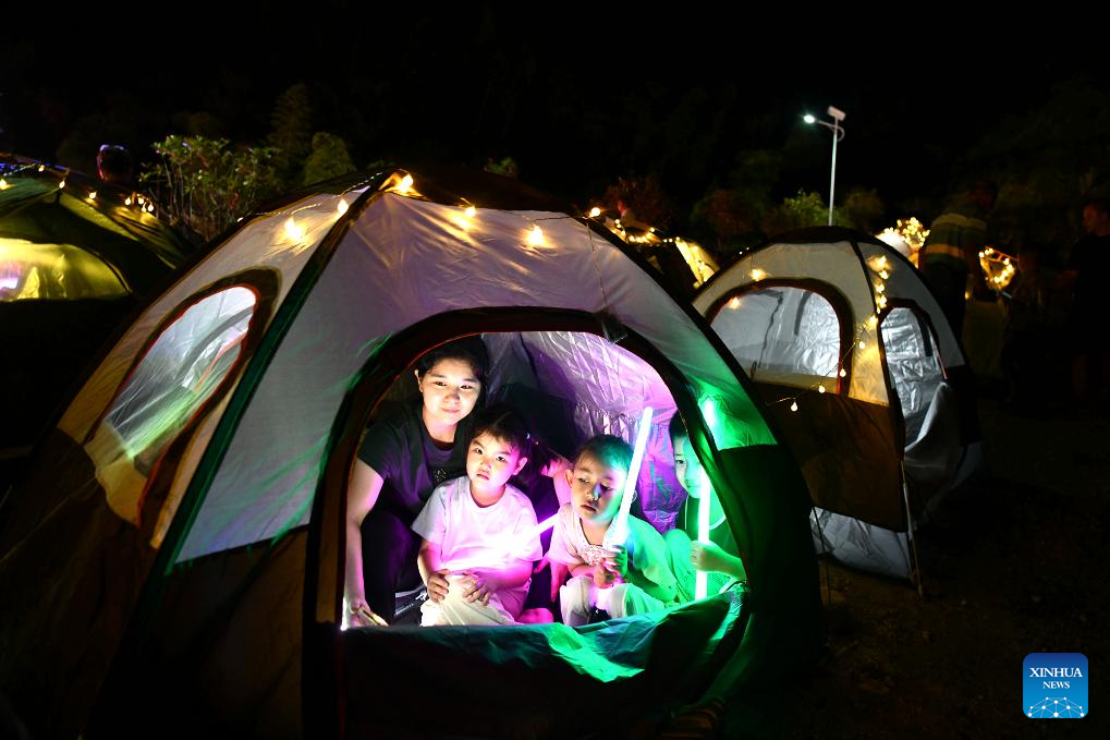 People enjoy the pleasure of camping at a forest farm in Tongcheng County of Xianning City, central China's Hubei Province, Aug. 29, 2025. (Photo by Liu Jianping/Xinhua)