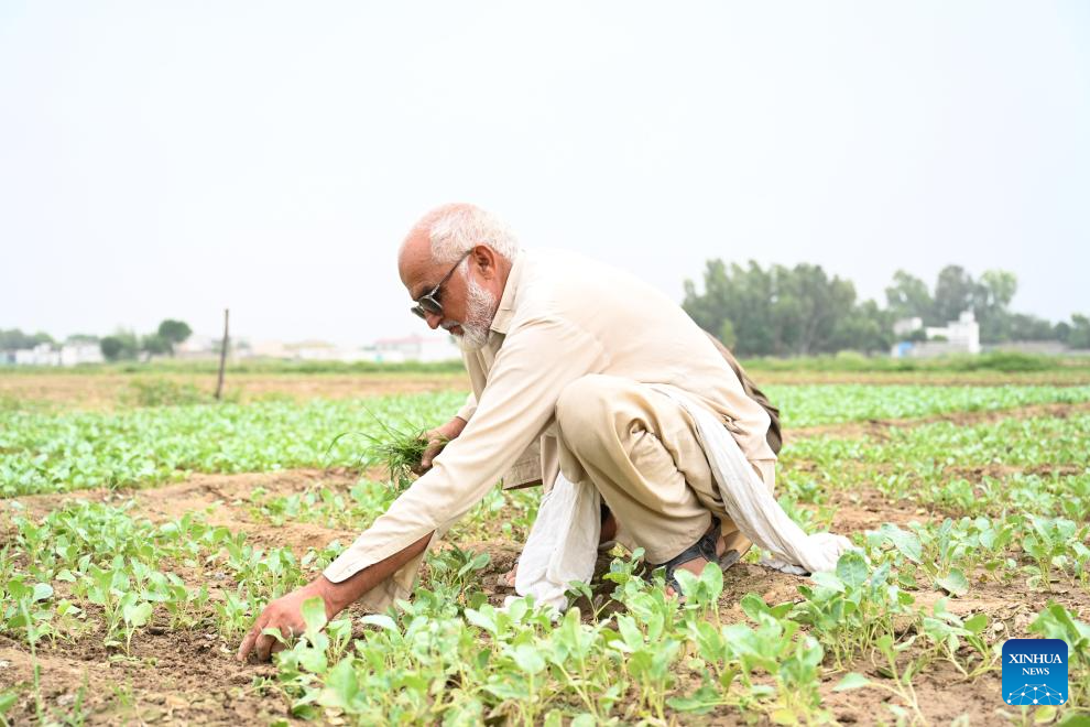 A farmer weeds a Chinese cauliflower field in Attock district of Pakistan's eastern Punjab province on Aug. 13, 2025. In recent years, Tianjin's cauliflower seed exports to Pakistan have accounted for over 70 percent of Pakistan's annual planting, helping to address bottlenecks in the local cauliflower industry. (Photo by Daniyal Khan Jadoon/Xinhua)