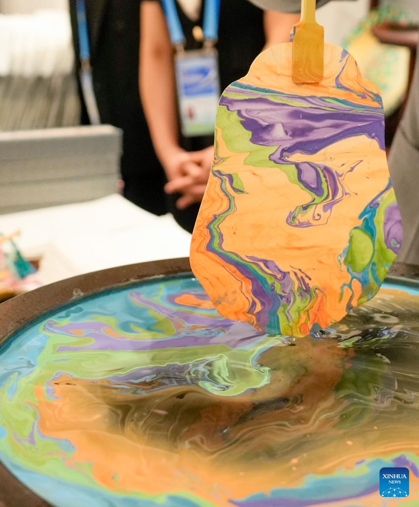 A guest tries lacquer fan crafting before a welcoming banquet at the Meijiang Convention and Exhibition Center in Tianjin, north China, Aug. 31, 2025. Chinese President Xi Jinping and his wife, Peng Liyuan, on Sunday hosted a banquet in China's port city of Tianjin to welcome international guests who are here to attend the Shanghai Cooperation Organization (SCO) Summit 2025.