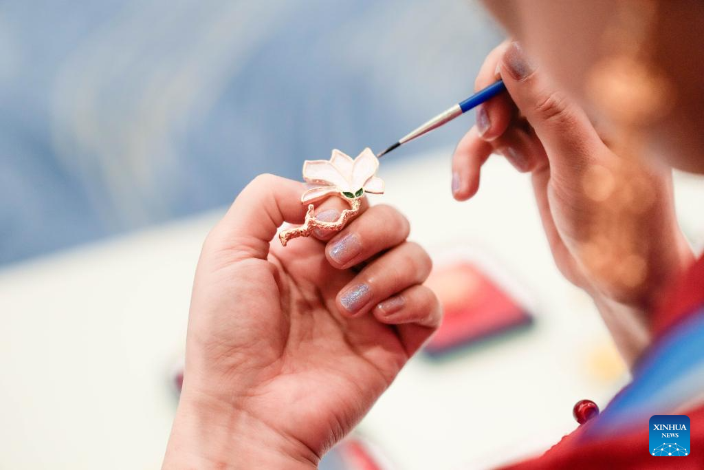 A staff member displays filigree mosaic craft before a welcoming banquet at the Meijiang Convention and Exhibition Center in Tianjin, north China, Aug. 31, 2025. Chinese President Xi Jinping and his wife, Peng Liyuan, on Sunday hosted a banquet in China's port city of Tianjin to welcome international guests who are here to attend the Shanghai Cooperation Organization (SCO) Summit 2025.