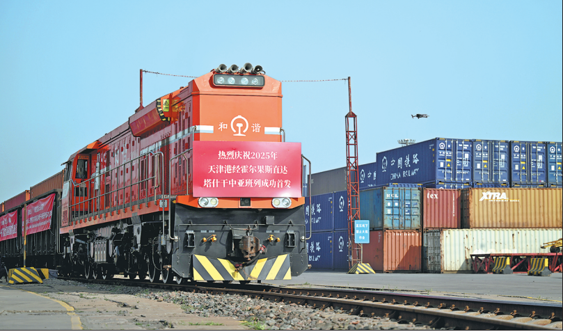 A China-Central Asia freight train, traveling to Tashkent via Khorgos, departs from Tianjin Port on May 20. ZHAO ZISHUO/XINHUA