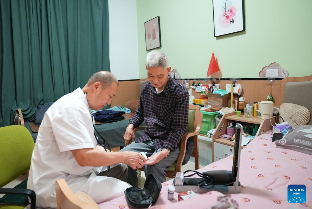 A doctor conducts medical examination for a senior resident (R) at a comprehensive elderly care center in Yingmenkou subdistrict of Chengdu, southwest China's Sichuan Province, Sept. 1, 2025. The comprehensive elderly care center covers an area of 1,400 square meters and serves multiple residential communities. Supported by the government and run by enterprise management with social participation, this community-based elderly care complex offers full-time care, daycare, rehabilitation therapies, and professional nursing services. (Xinhua/Jiang Hongjing)