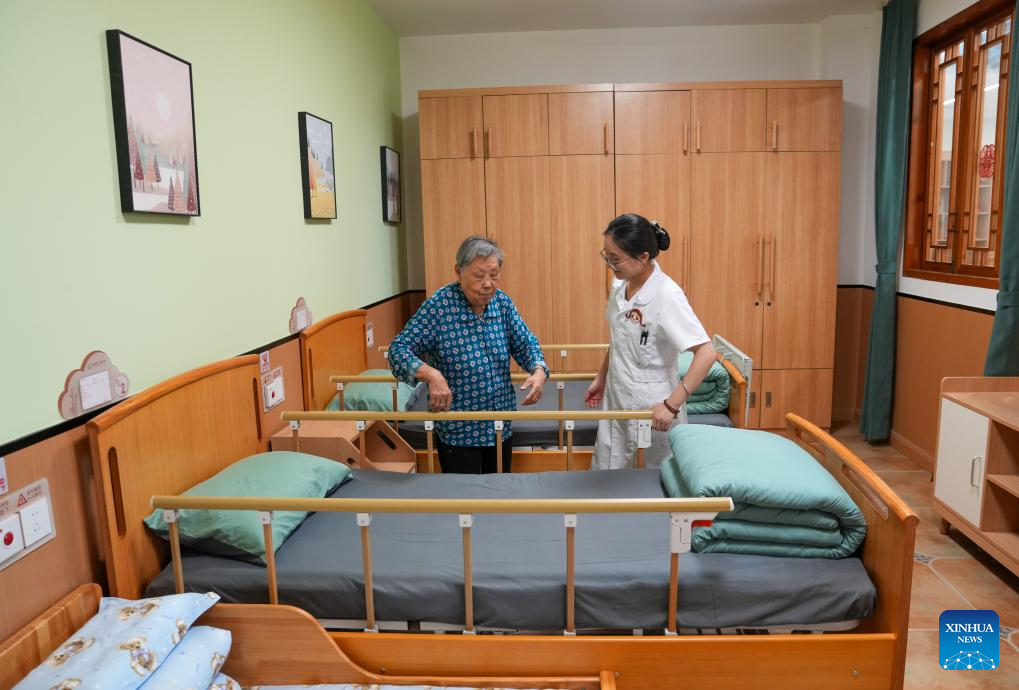 A senior resident learns about daycare service under the guidance of a staff member at a comprehensive elderly care center in Yingmenkou subdistrict of Chengdu, southwest China's Sichuan Province, Sept. 1, 2025. The comprehensive elderly care center covers an area of 1,400 square meters and serves multiple residential communities. Supported by the government and run by enterprise management with social participation, this community-based elderly care complex offers full-time care, daycare, rehabilitation therapies, and professional nursing services. (Xinhua/Jiang Hongjing)