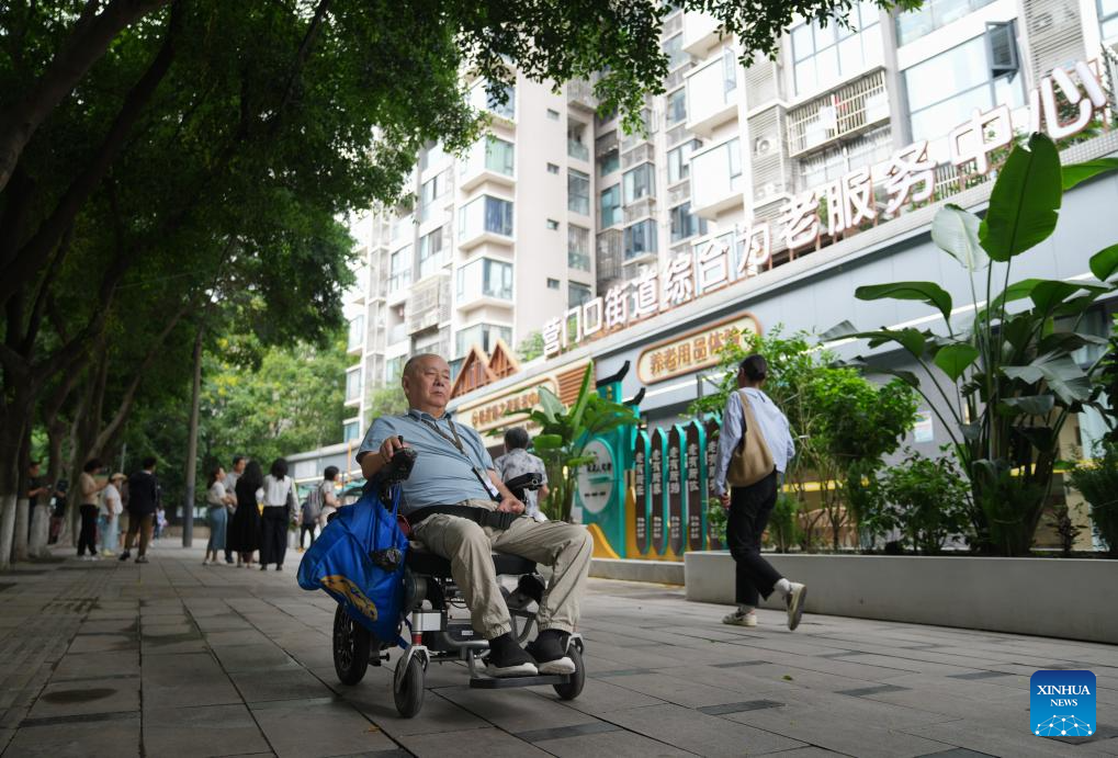A senior resident arrives in wheelchair at a comprehensive elderly care center in Yingmenkou subdistrict of Chengdu, southwest China's Sichuan Province, Sept. 1, 2025. The comprehensive elderly care center covers an area of 1,400 square meters and serves multiple residential communities. Supported by the government and run by enterprise management with social participation, this community-based elderly care complex offers full-time care, daycare, rehabilitation therapies, and professional nursing services. (Xinhua/Jiang Hongjing)