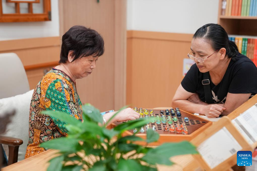 Senior residents play Chinese checkers at a comprehensive elderly care center in Yingmenkou subdistrict of Chengdu, southwest China's Sichuan Province, Sept. 1, 2025. The comprehensive elderly care center covers an area of 1,400 square meters and serves multiple residential communities. Supported by the government and run by enterprise management with social participation, this community-based elderly care complex offers full-time care, daycare, rehabilitation therapies, and professional nursing services. (Xinhua/Jiang Hongjing)