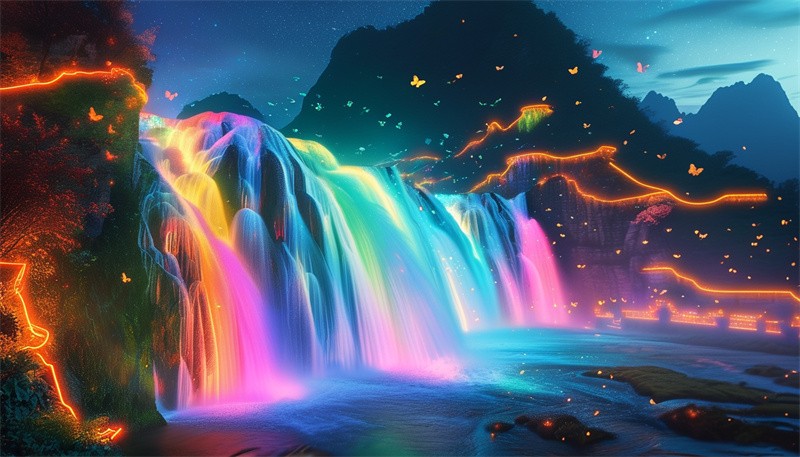 An AI-generated image shows a fantastical illuminated waterfall display at Huangguoshu Waterfall scenic area in Anshun, southwest China's Guizhou Province.