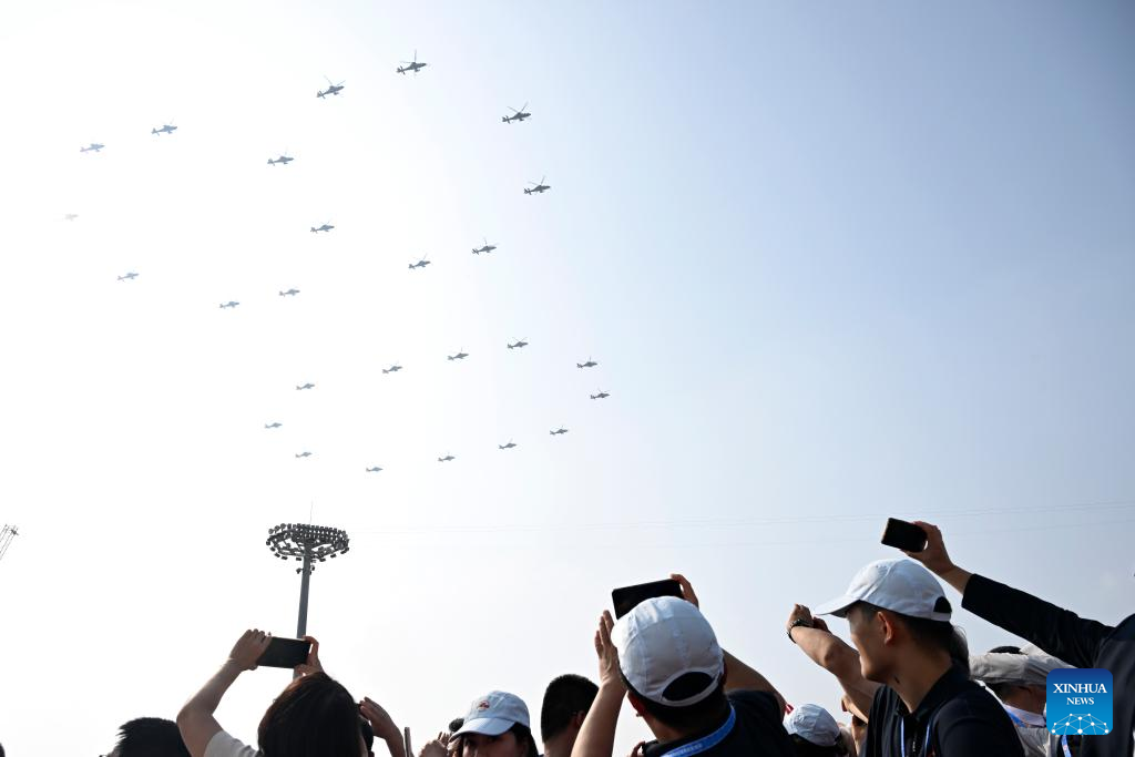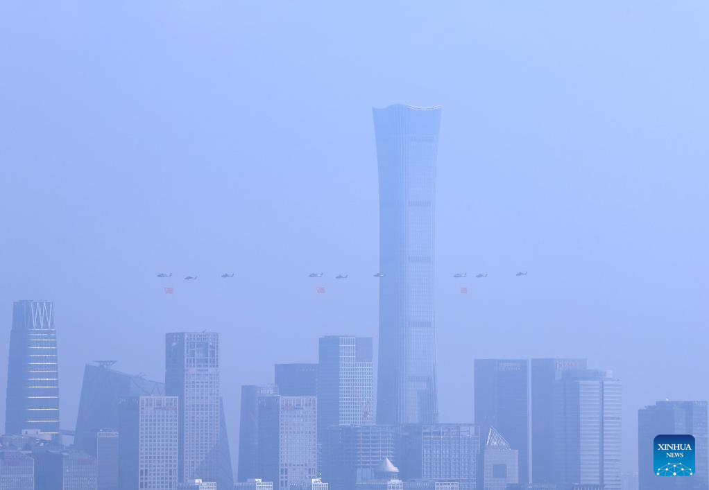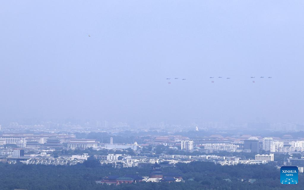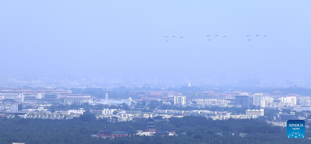 The flag-guarding air echelon takes part in a grand gathering to commemorate the 80th anniversary of the victory in the Chinese People's War of Resistance against Japanese Aggression and the World Anti-Fascist War in Beijing, capital of China, Sept. 3, 2025. (Xinhua/Dai Qiaochu)