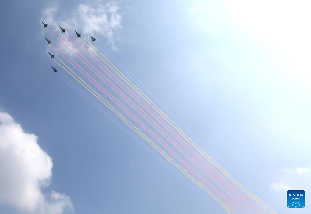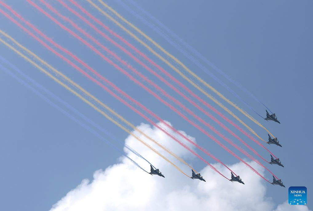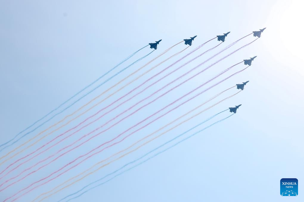 The echelon of trainer aircraft attends a parade during a grand gathering to commemorate the 80th anniversary of the victory in the Chinese People's War of Resistance against Japanese Aggression and the World Anti-Fascist War in Beijing, capital of China, Sept. 3, 2025. (Xinhua/Zhang Chenlin)