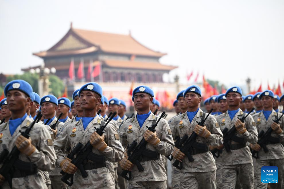 The Chinese UN peacekeepers formation attends a military parade in Beijing, capital of China, Sept. 3, 2025. China on Wednesday held a grand gathering to commemorate the 80th anniversary of the victory in the Chinese People's War of Resistance against Japanese Aggression and the World Anti-Fascist War. (Xinhua/Zhang Long)