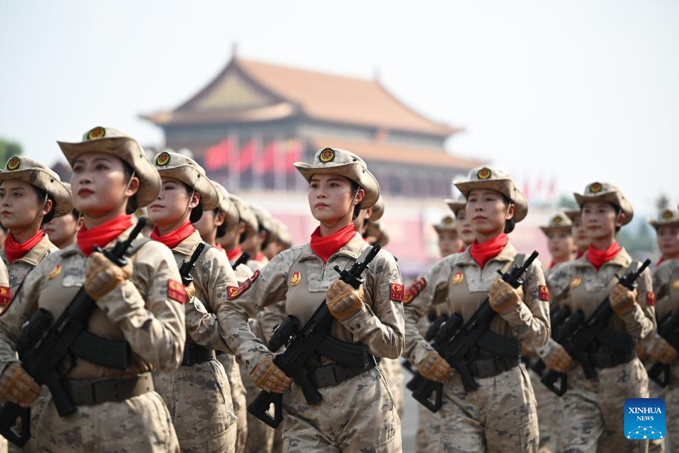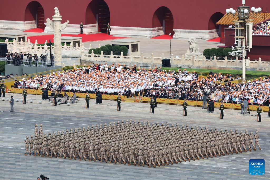A formation of military reserve force attends a parade during a grand gathering to commemorate the 80th anniversary of the victory in the Chinese People's War of Resistance against Japanese Aggression and the World Anti-Fascist War in Beijing, capital of China, Sept. 3, 2025. (Xinhua/Jin Liwang)