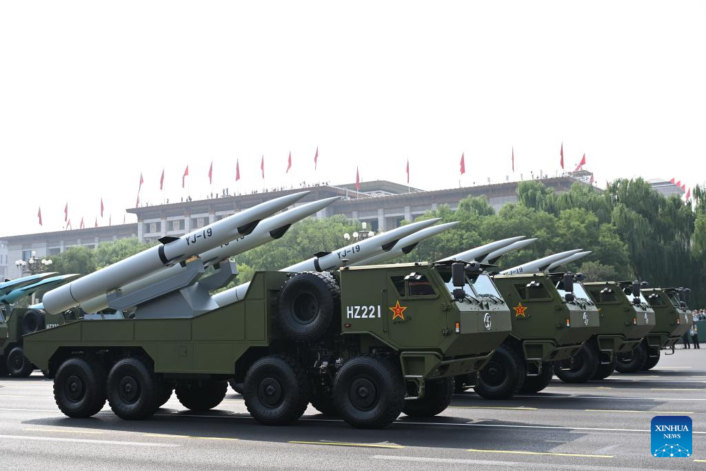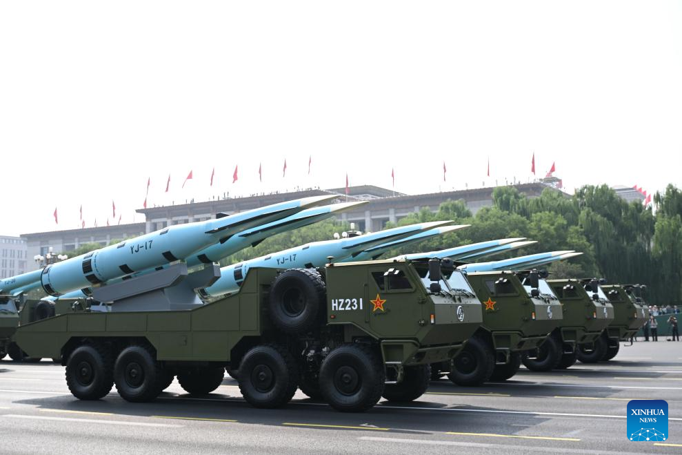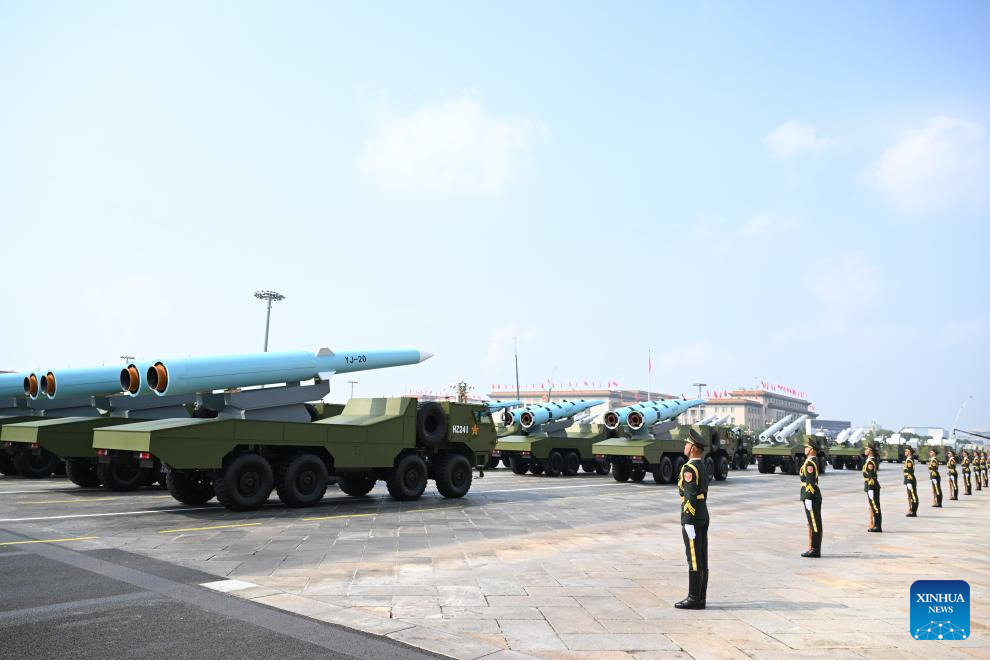 The anti-ship missile formation attends a parade during a grand gathering to commemorate the 80th anniversary of the victory in the Chinese People's War of Resistance against Japanese Aggression and the World Anti-Fascist War in Beijing, capital of China, Sept. 3, 2025. (Xinhua/Yang Guanyu)