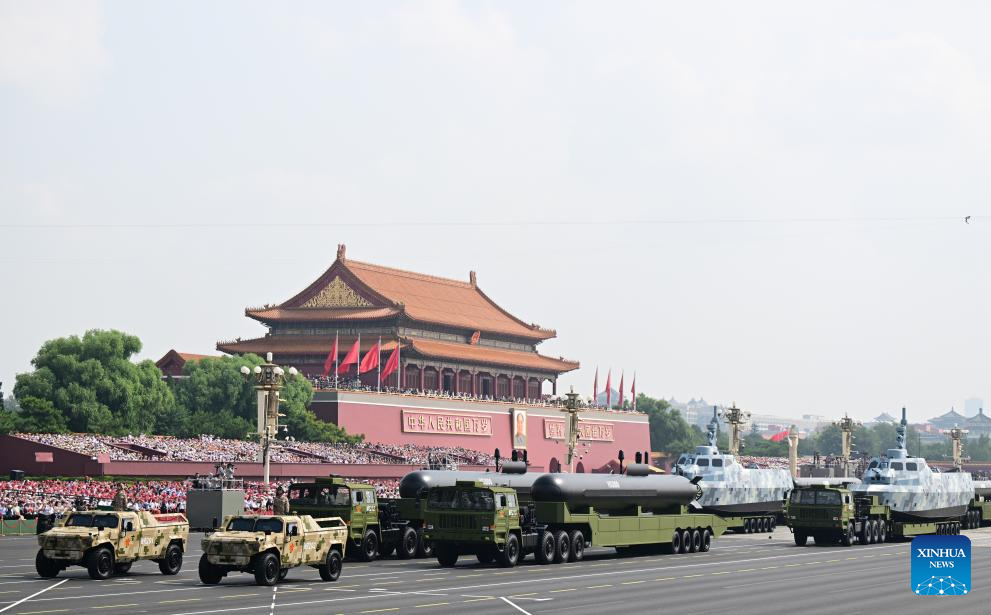 The sea-based unmanned warfare formation attends a military parade in Beijing, capital of China, Sept. 3, 2025. China on Wednesday held a grand gathering to commemorate the 80th anniversary of the victory in the Chinese People's War of Resistance against Japanese Aggression and the World Anti-Fascist War. (Xinhua/Xiong Qi)