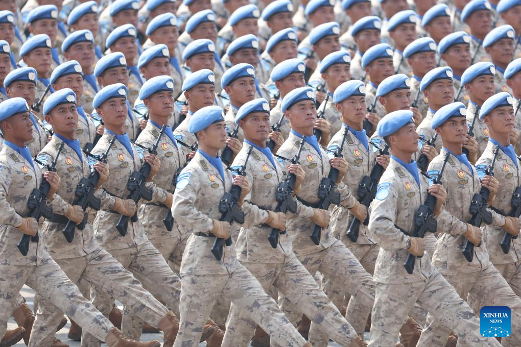 Chinese UN peacekeepers march through Tian'anmen Square during a military parade in Beijing, capital of China, Sept. 3, 2025. China on Wednesday held a grand gathering to commemorate the 80th anniversary of the victory in the Chinese People's War of Resistance against Japanese Aggression and the World Anti-Fascist War. (Xinhua/Chen Bin)