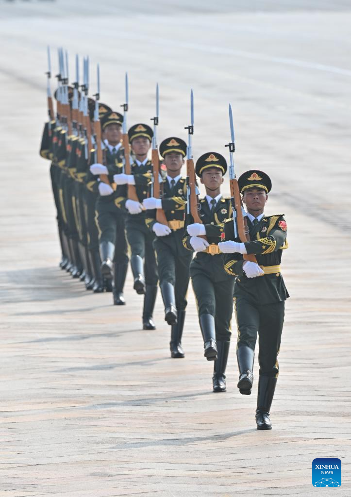 Parade guards step in place during a grand gathering to commemorate the 80th anniversary of the victory in the Chinese People's War of Resistance against Japanese Aggression and the World Anti-Fascist War in Beijing, capital of China, Sept. 3, 2025. (Xinhua/Chen Cheng)
