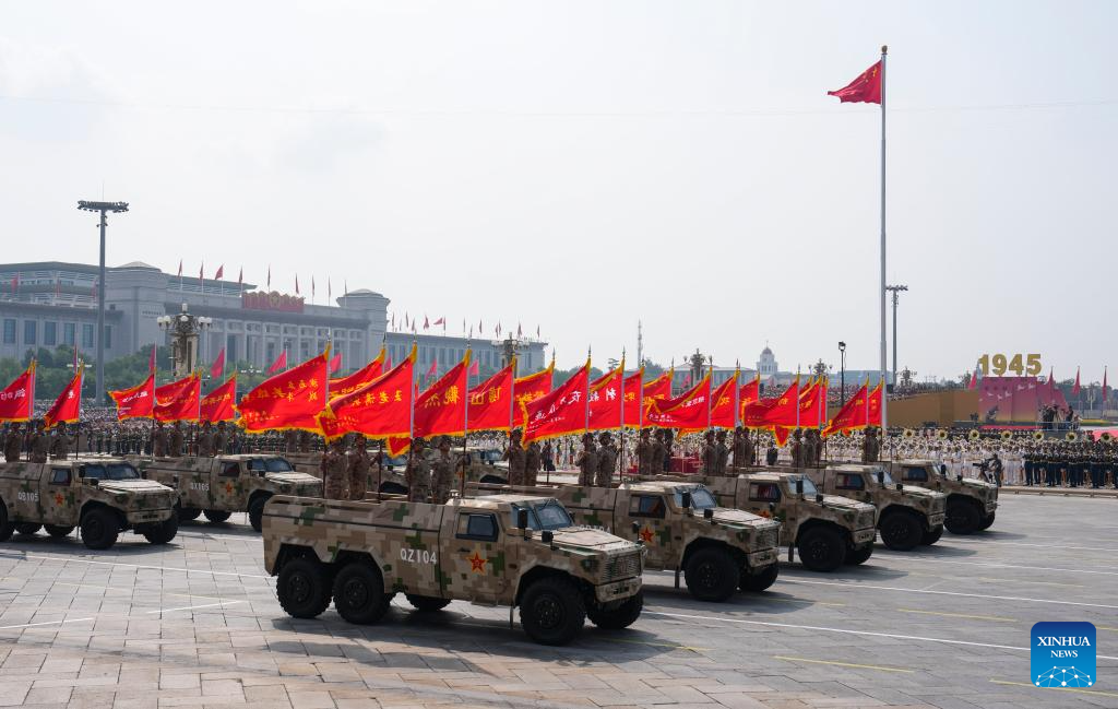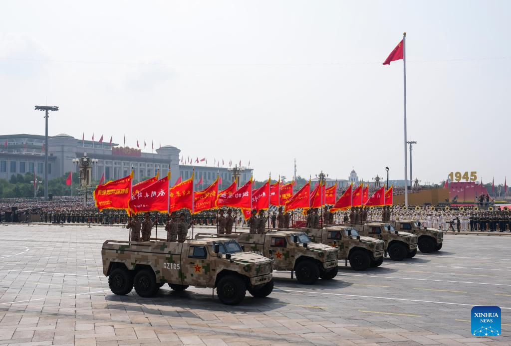 Hero units' banner formation marches through Tian'anmen Square during a military parade in Beijing, capital of China, Sept. 3, 2025. China on Wednesday held a grand gathering to commemorate the 80th anniversary of the victory in the Chinese People's War of Resistance against Japanese Aggression and the World Anti-Fascist War. (Xinhua/Ju Huanzong)