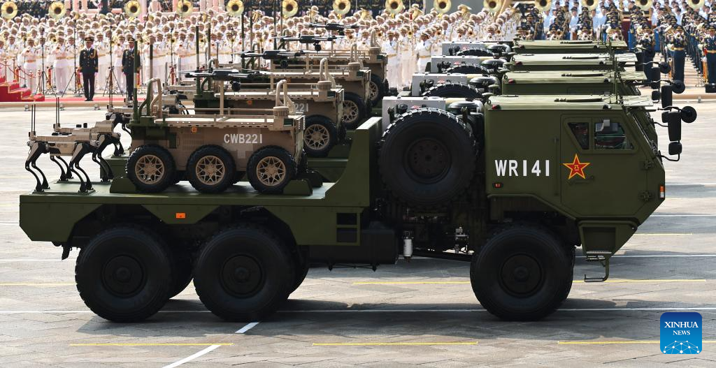 The land-based unmanned warfare formation attends a military parade in Beijing, capital of China, Sept. 3, 2025. China on Wednesday held a grand gathering to commemorate the 80th anniversary of the victory in the Chinese People's War of Resistance against Japanese Aggression and the World Anti-Fascist War. (Xinhua/Li Gang)