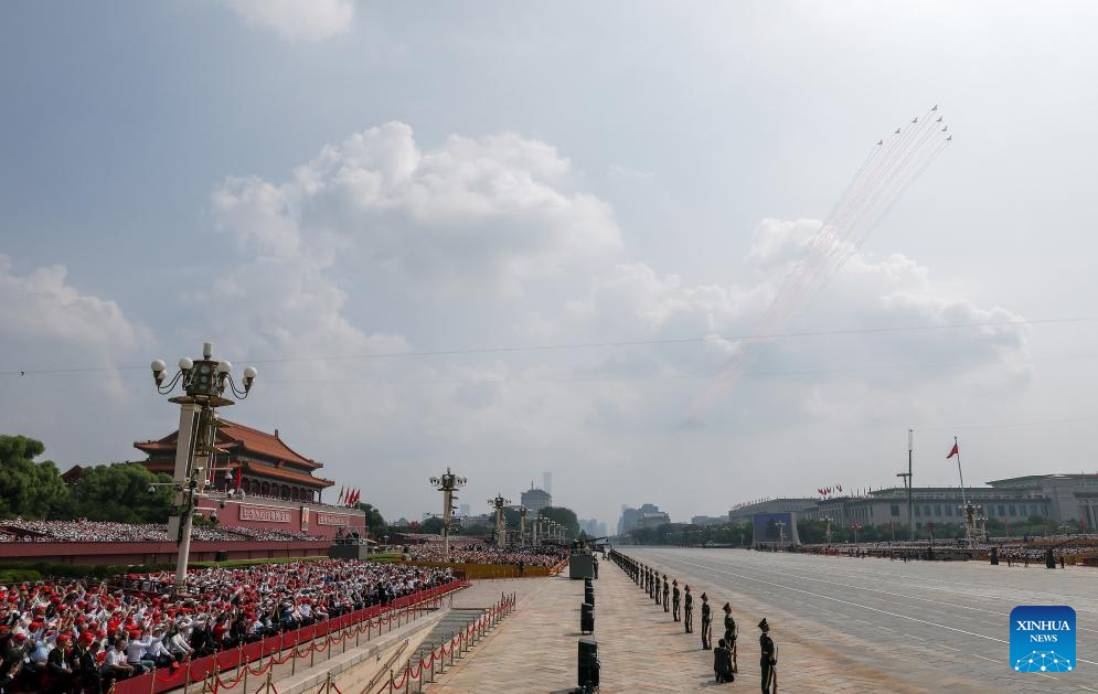 The trainer aircraft echelon attends a military parade in Beijing, capital of China, Sept. 3, 2025. China on Wednesday held a grand gathering to commemorate the 80th anniversary of the victory in the Chinese People's War of Resistance against Japanese Aggression and the World Anti-Fascist War. (Xinhua/Chen Cheng)