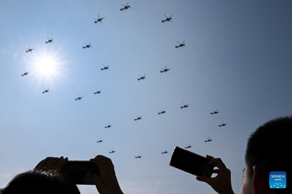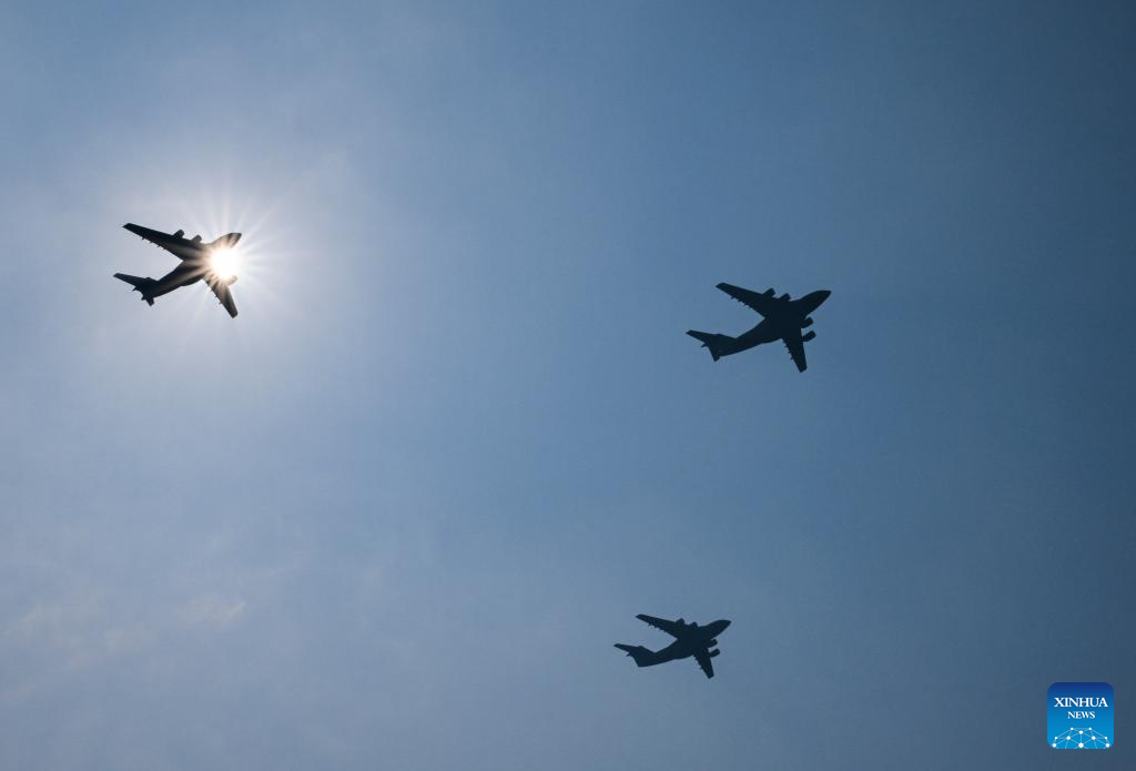 The transport aircraft echelon attends a military parade in Beijing, capital of China, Sept. 3, 2025. China on Wednesday held a grand gathering to commemorate the 80th anniversary of the victory in the Chinese People's War of Resistance against Japanese Aggression and the World Anti-Fascist War. (Xinhua/Lian Zhen)