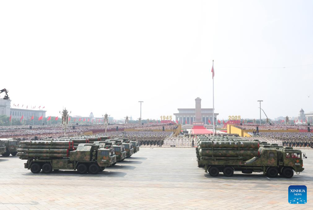 The air defense weaponry formation attends a military parade in Beijing, capital of China, Sept. 3, 2025. China on Wednesday held a grand gathering to commemorate the 80th anniversary of the victory in the Chinese People's War of Resistance against Japanese Aggression and the World Anti-Fascist War. (Xinhua/Chen Bin)