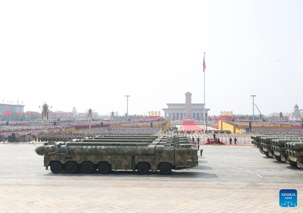 The hypersonic missile formation attends a military parade in Beijing, capital of China, Sept. 3, 2025. China on Wednesday held a grand gathering to commemorate the 80th anniversary of the victory in the Chinese People's War of Resistance against Japanese Aggression and the World Anti-Fascist War. (Xinhua/Chen Bin)