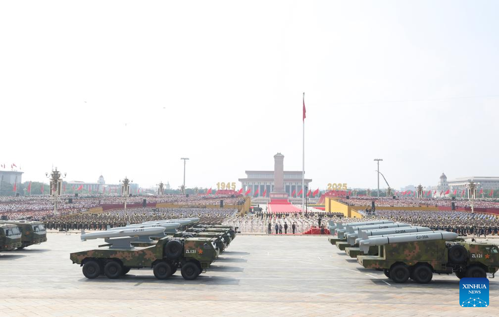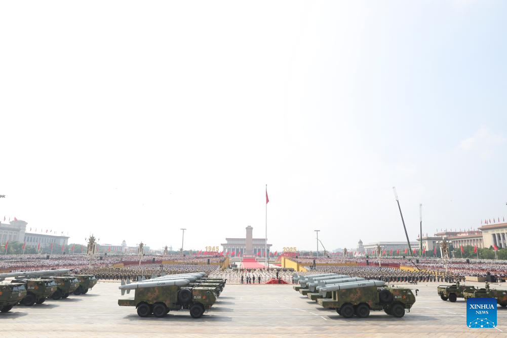 The hypersonic missile formation attends a military parade in Beijing, capital of China, Sept. 3, 2025. China on Wednesday held a grand gathering to commemorate the 80th anniversary of the victory in the Chinese People's War of Resistance against Japanese Aggression and the World Anti-Fascist War. (Xinhua/Chen Bin)