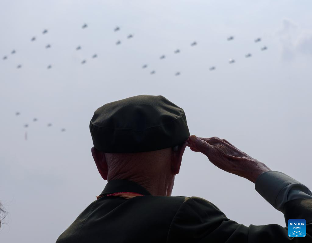 A veteran at Tian'anmen Rostrum salutes during a military parade in Beijing, capital of China, Sept. 3, 2025. China on Wednesday held a grand gathering to commemorate the 80th anniversary of the victory in the Chinese People's War of Resistance against Japanese Aggression and the World Anti-Fascist War. (Xinhua/Cai Yang)