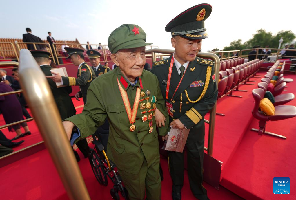 A veteran ascends Tian'anmen Rostrum ahead of a military parade in Beijing, capital of China, Sept. 3, 2025. China on Wednesday held a grand gathering to commemorate the 80th anniversary of the victory in the Chinese People's War of Resistance against Japanese Aggression and the World Anti-Fascist War. (Xinhua/Cai Yang)