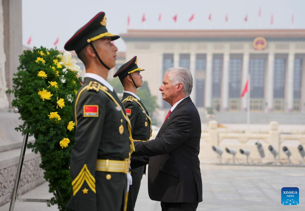 Cuban president lays wreath at Monument to People's Heroes on Tian'anmen Square in Beijing