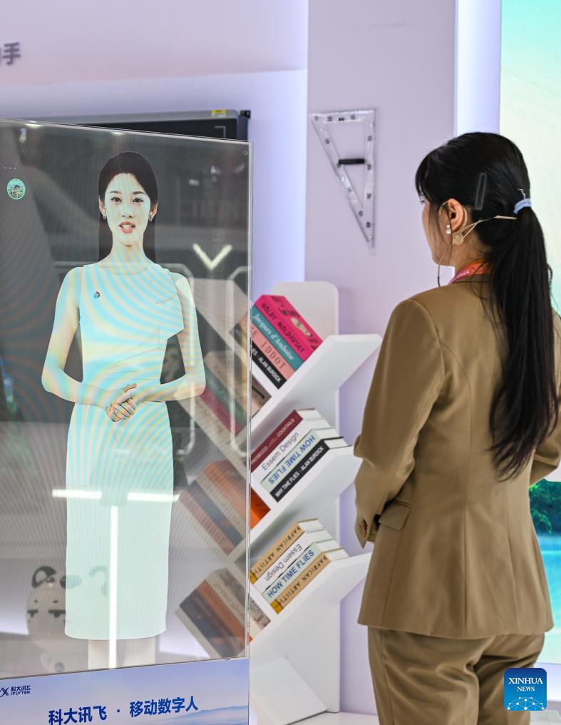 A staff member interacts with a digital human at the venue of the World Smart Industry Expo 2025 in southwest China's Chongqing, Sept. 4, 2025. The expo is scheduled for Sept. 5 to 8 in Chongqing to present cutting-edge achievements of the smart industry through professional exhibitions. (Xinhua/Wang Quanchao)
