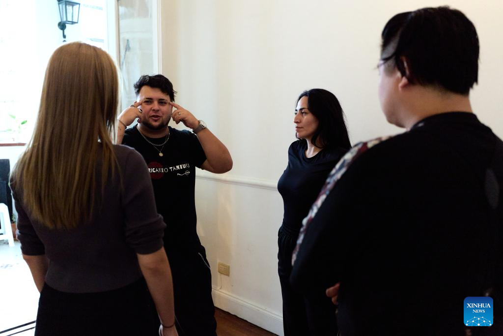 Su Junqiang (2nd R) and Guo Xingzhu (1st R) communicate with Sebastian Bolivar (1st L) and Cynthia Palacios in a dance studio in Buenos Aires, Argentina, on Aug. 28, 2025. (Xinhua/Meng Dingbo)
