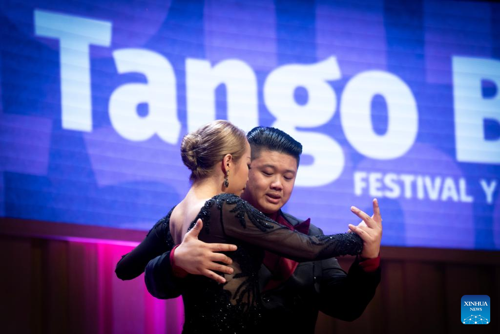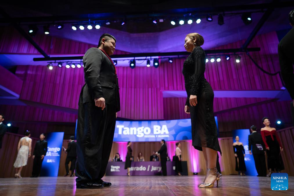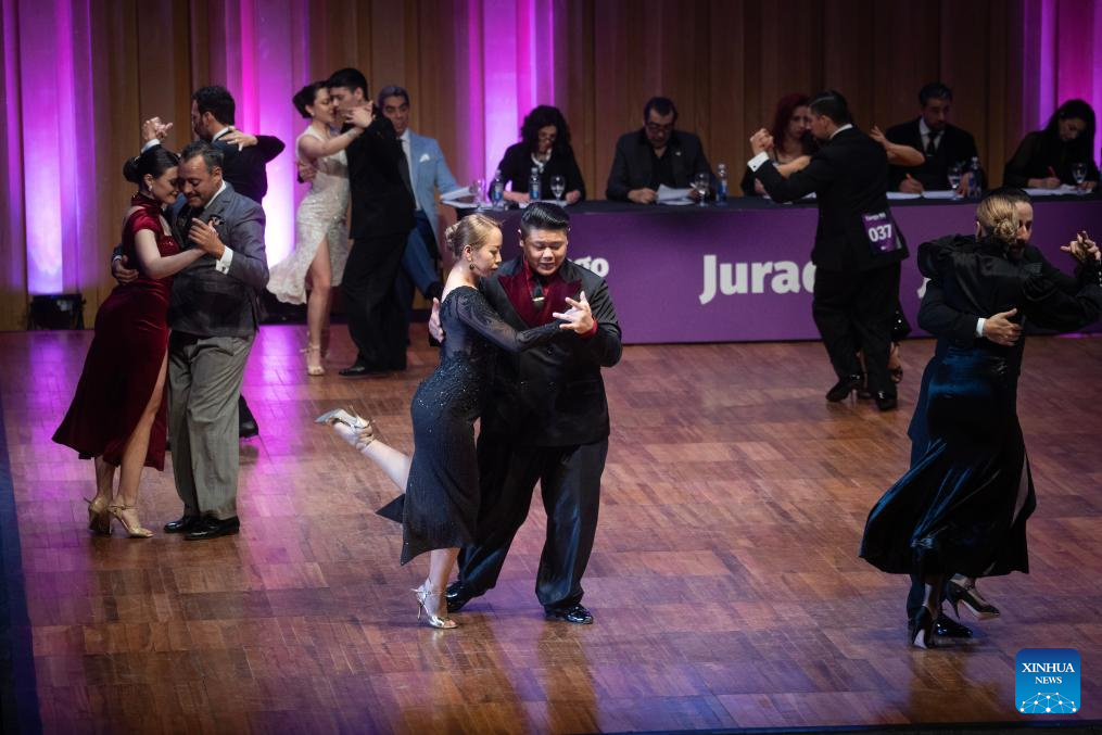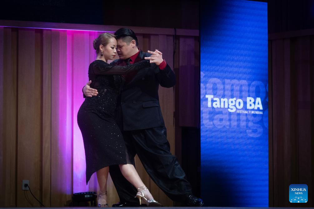 Su Junqiang (R) and Guo Xingzhu perform during the Champions' Milonga in Buenos Aires, Argentina, on Sept. 3, 2025. (Xinhua/Meng Dingbo)