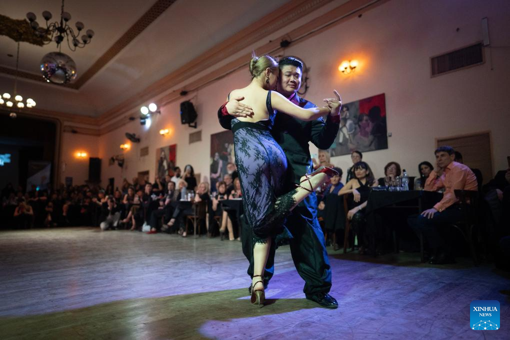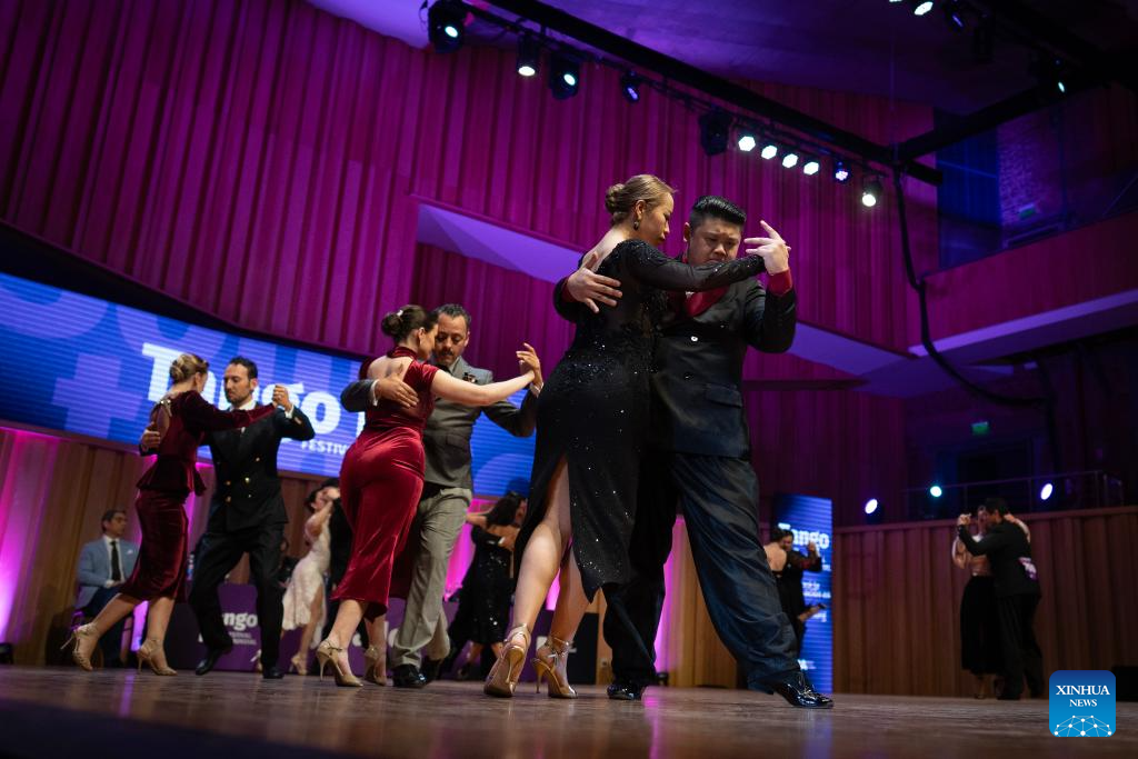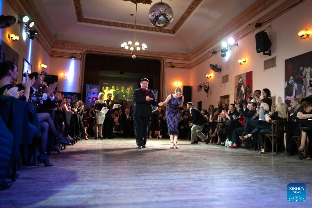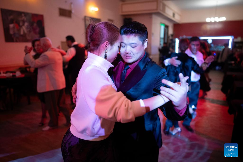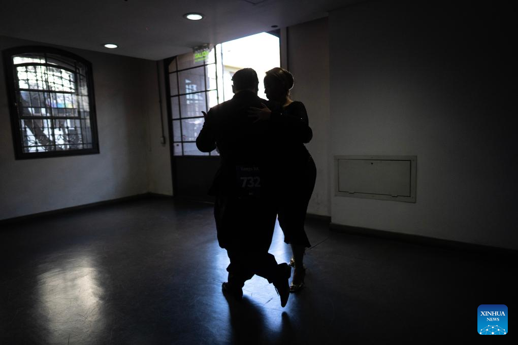 Su Junqiang (R) and Guo Xingzhu perform during the Champions' Milonga in Buenos Aires, Argentina, on Sept. 3, 2025. (Xinhua/Meng Dingbo)
