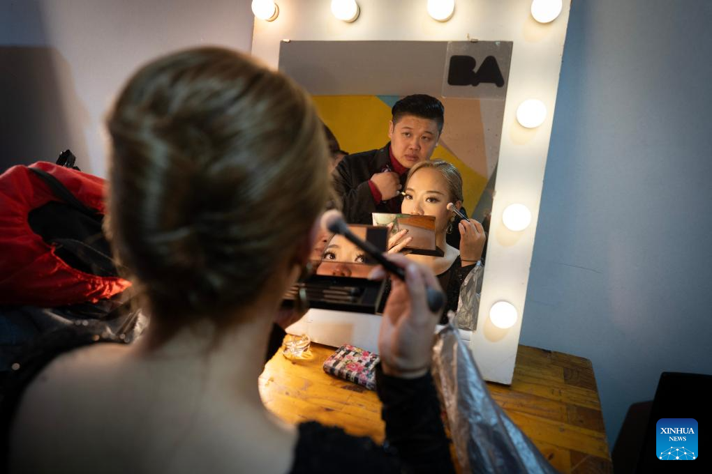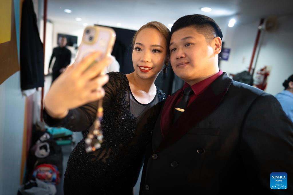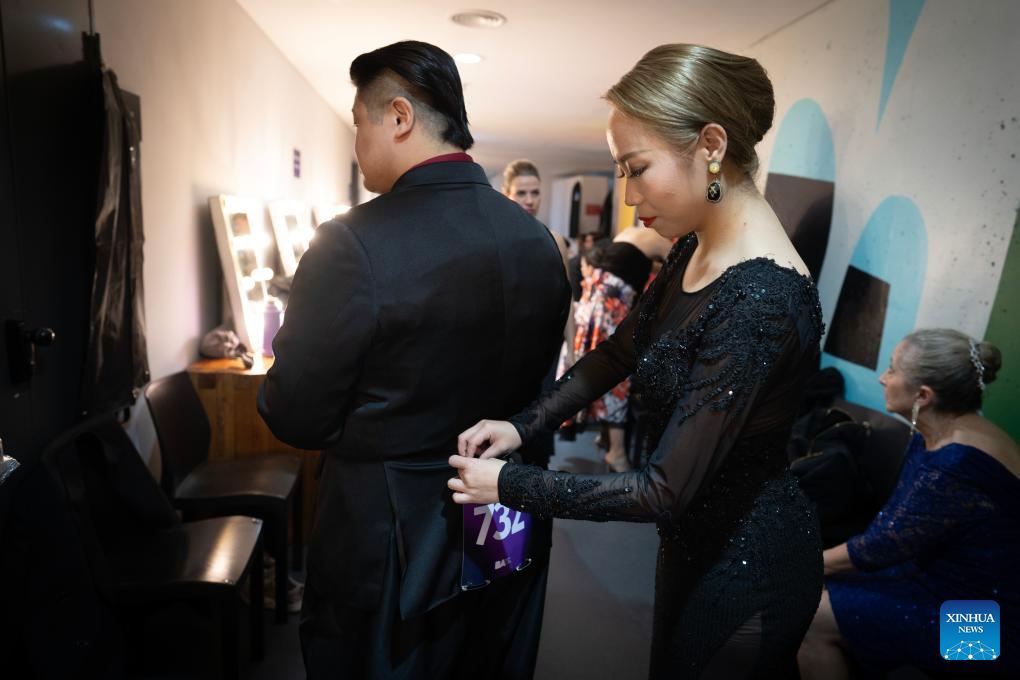 Su Junqiang (top) and Guo Xingzhu prepare before the quarterfinals of the Tango de Pista competition at the Tango World Cup in Buenos Aires, Argentina, on Aug. 27, 2025. (Xinhua/Meng Dingbo)