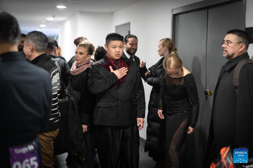 Su Junqiang (C) prepares before the quarterfinals of the Tango de Pista competition at the Tango World Cup in Buenos Aires, Argentina, on Aug. 27, 2025. (Xinhua/Meng Dingbo)