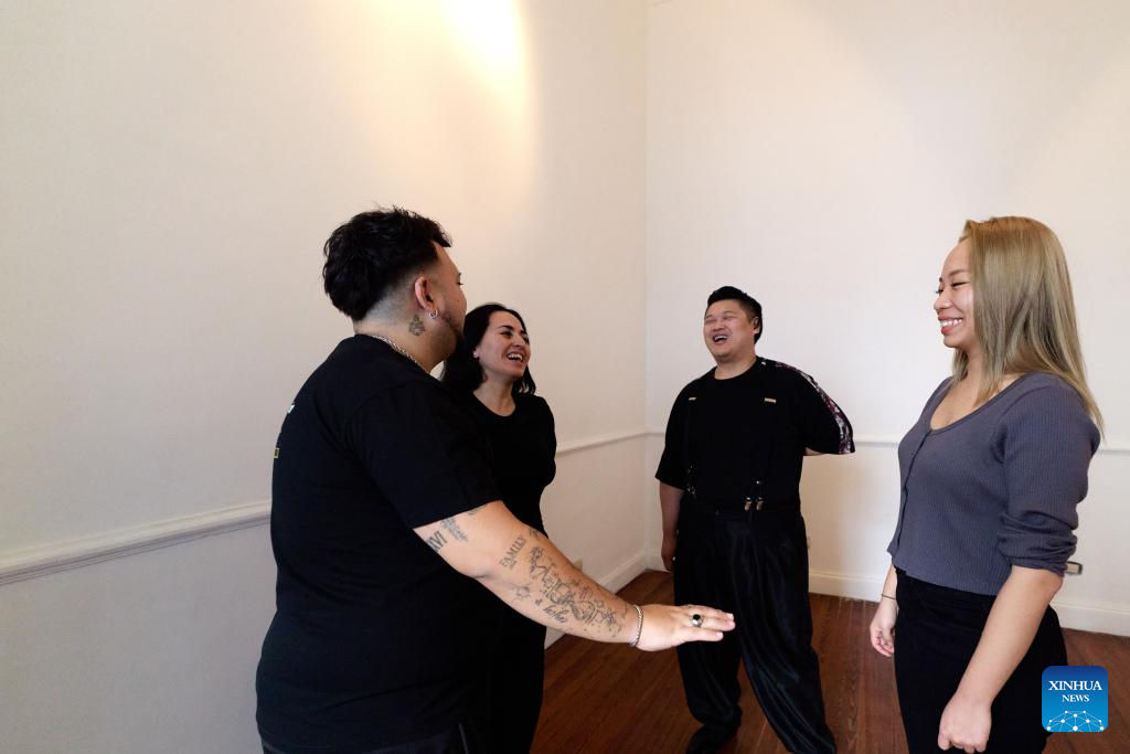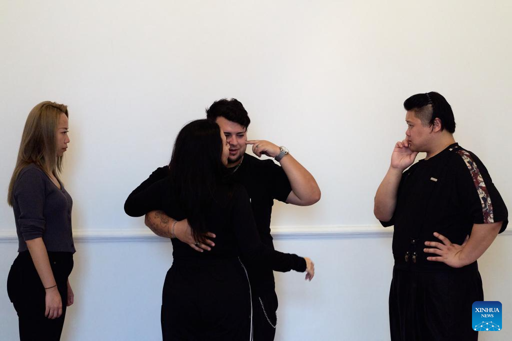 Sebastian Bolivar (1st L) and Cynthia Palacios (2nd L) watch Su Junqiang (2nd R) and Guo Xingzhu practicing in a dance studio in Buenos Aires, Argentina, on Aug. 28, 2025. (Xinhua/Meng Dingbo)