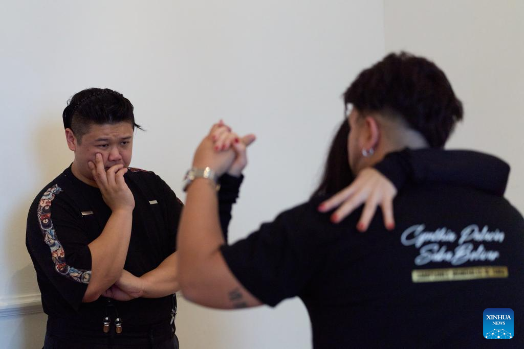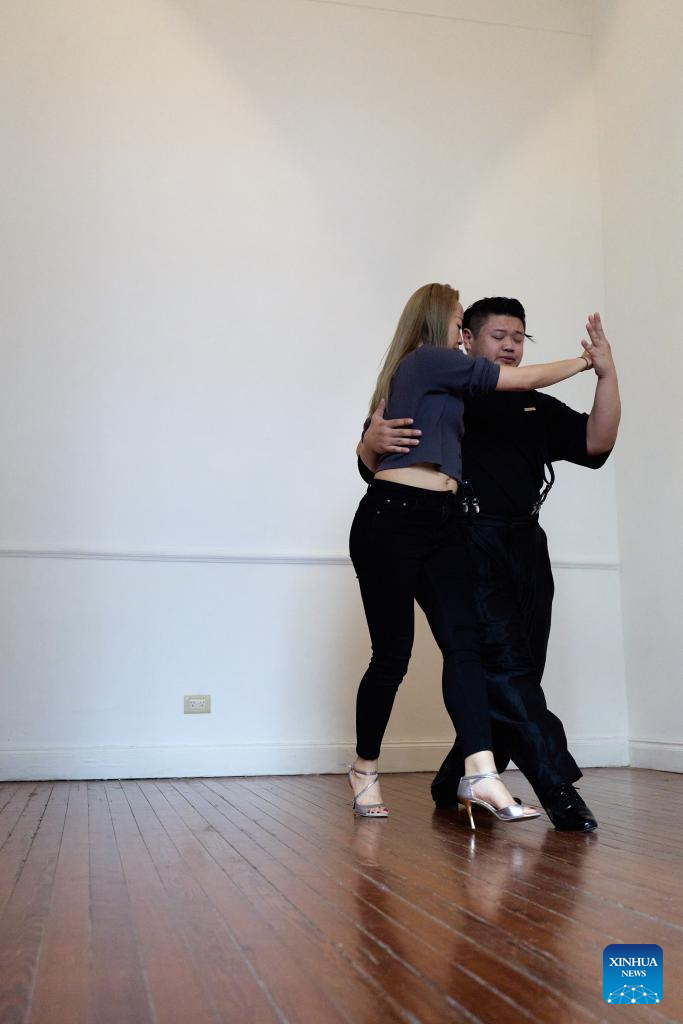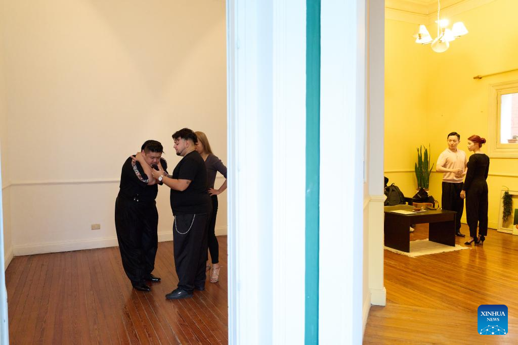 Su Junqiang (R) and Guo Xingzhu practice in a dance studio in Buenos Aires, Argentina, on Aug. 28, 2025. (Xinhua/Meng Dingbo)