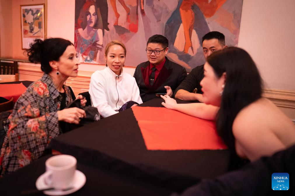 Su Junqiang (1st R) and Guo Xingzhu (1st L) communicate with Sebastian Bolivar (2nd L) and Cynthia Palacios in a dance studio in Buenos Aires, Argentina, on Aug. 28, 2025. (Xinhua/Meng Dingbo)