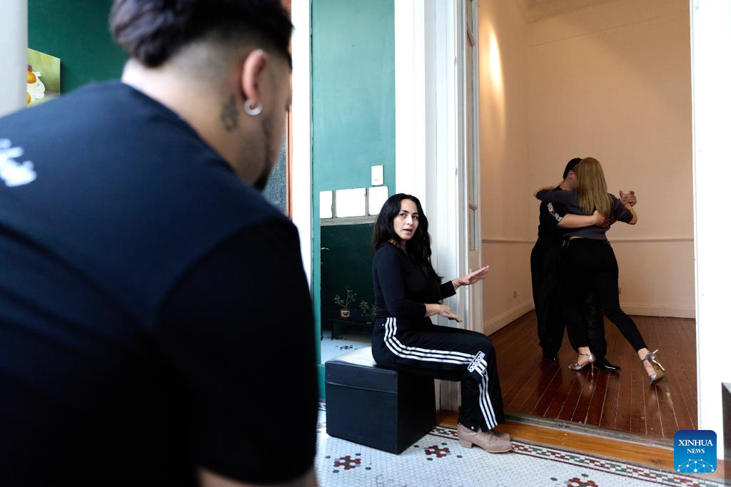 Su Junqiang (L) watches a demonstration during practice in a dance studio in Buenos Aires, Argentina, on Aug. 28, 2025. (Xinhua/Meng Dingbo)