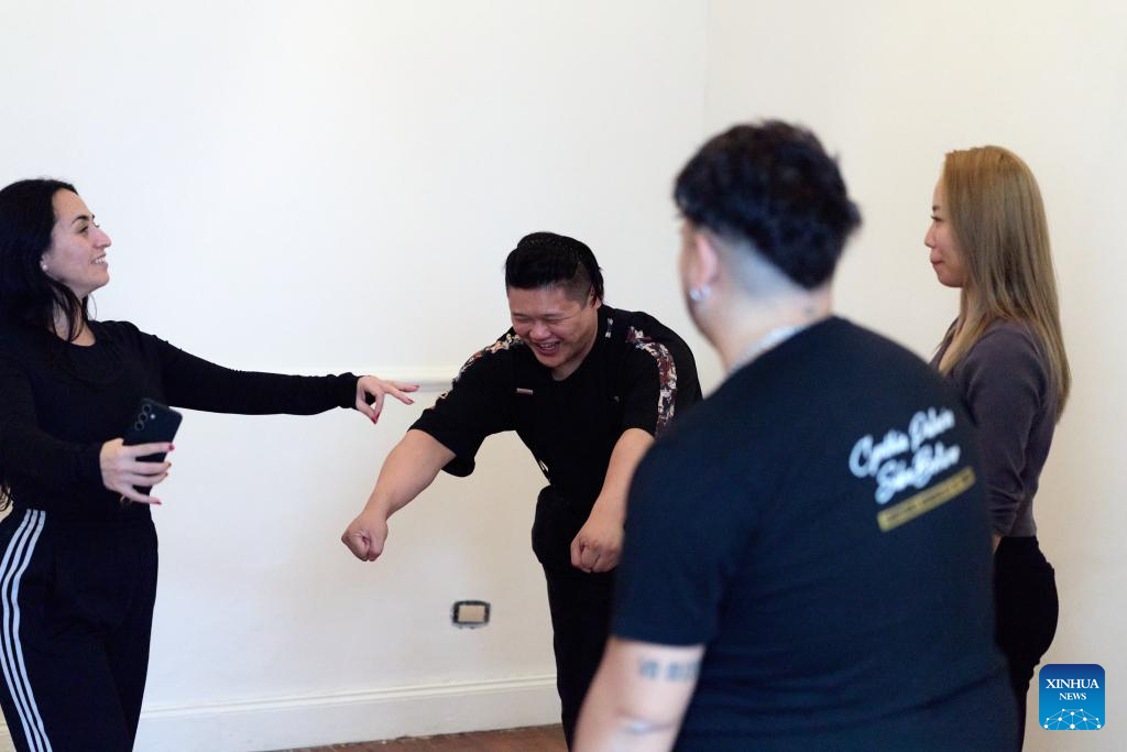 Su Junqiang (1st R) and Guo Xingzhu (1st L) communicate with Sebastian Bolivar (2nd R) and Cynthia Palacios in a dance studio in Buenos Aires, Argentina, on Aug. 28, 2025. (Xinhua/Meng Dingbo)