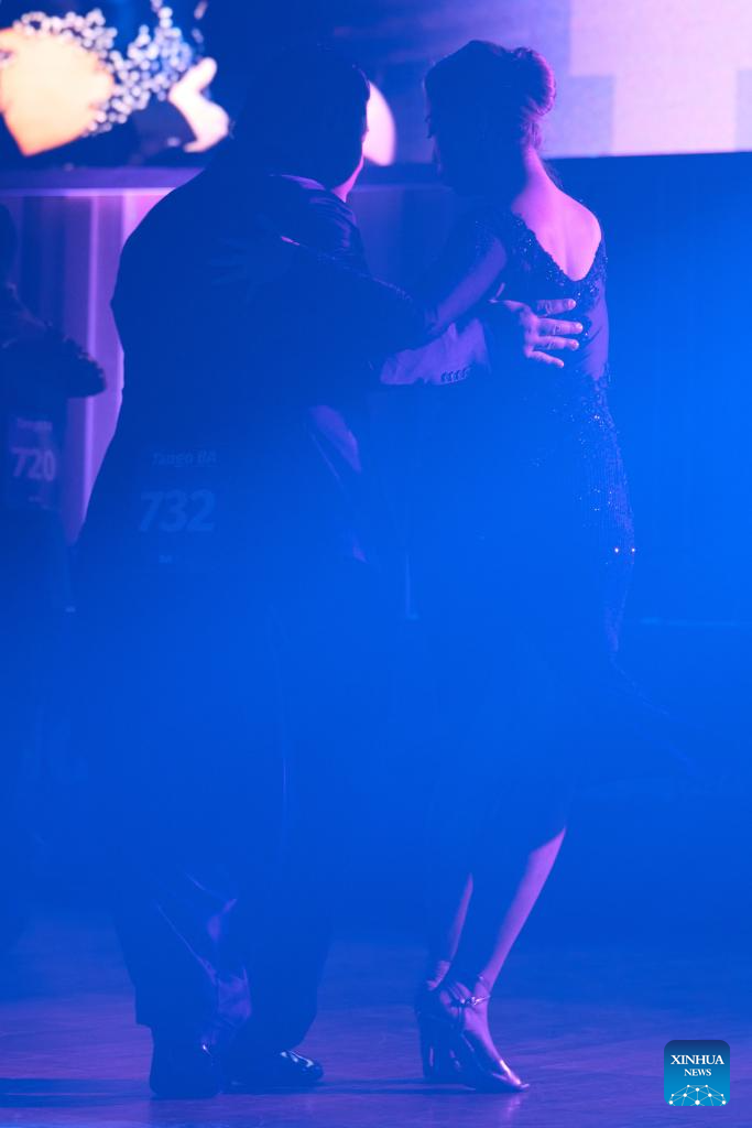 Su Junqiang (1st R) and Guo Xingzhu (2nd R) compete during the quarterfinals of the Tango de Pista competition at the Tango World Cup in Buenos Aires, Argentina, on Aug. 27, 2025. (Xinhua/Meng Dingbo)
