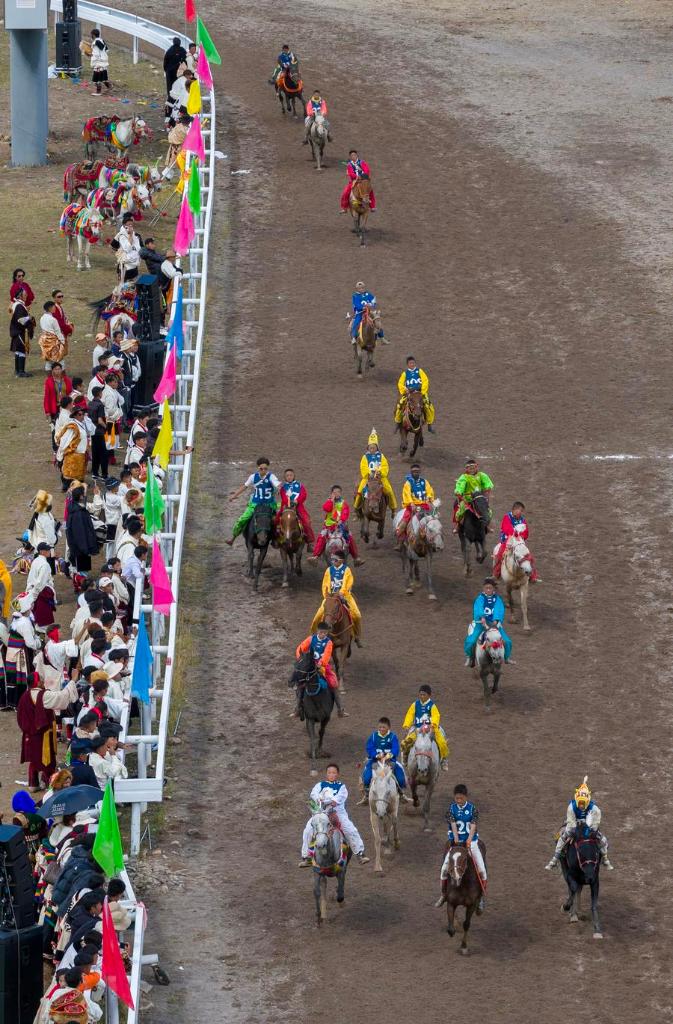 An aerial drone photo shows young riders participating in the 10,000-meter race during the 2025 edition of a traditional horse racing festival in Nagqu, southwest China's Xizang Autonomous Region, Sept. 5, 2025. (Xinhua/Jiang Fan)■