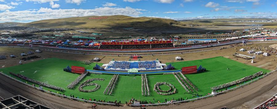 A performance is staged at the opening ceremony of the 2025 edition of a traditional horse racing festival in Nagqu, southwest China's Xizang Autonomous Region, Sept. 5, 2025. (Xinhua/Tenzin Nyida)