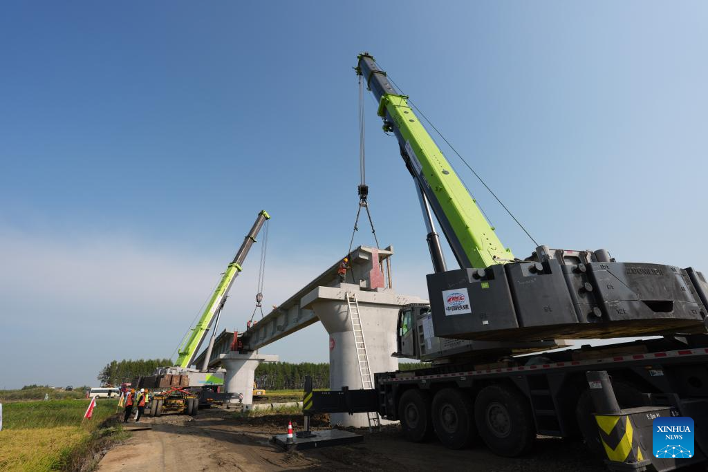 Workers operate at a construction site of the Tongjiang super major bridge in northeast China's Heilongjiang Province, on Sept. 5, 2025. The Tongjiang super major bridge, part of the capacity expansion and renovation project for the Jiamusi-Tongjiang Railway, started beam erection on Friday.