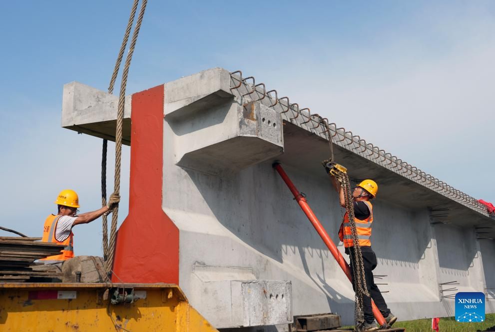 The 10,435-meter bridge has adopted a single-track T-beam structure, and is expected to see all its beams erected by August 2026. (Xinhua/Wang Song)