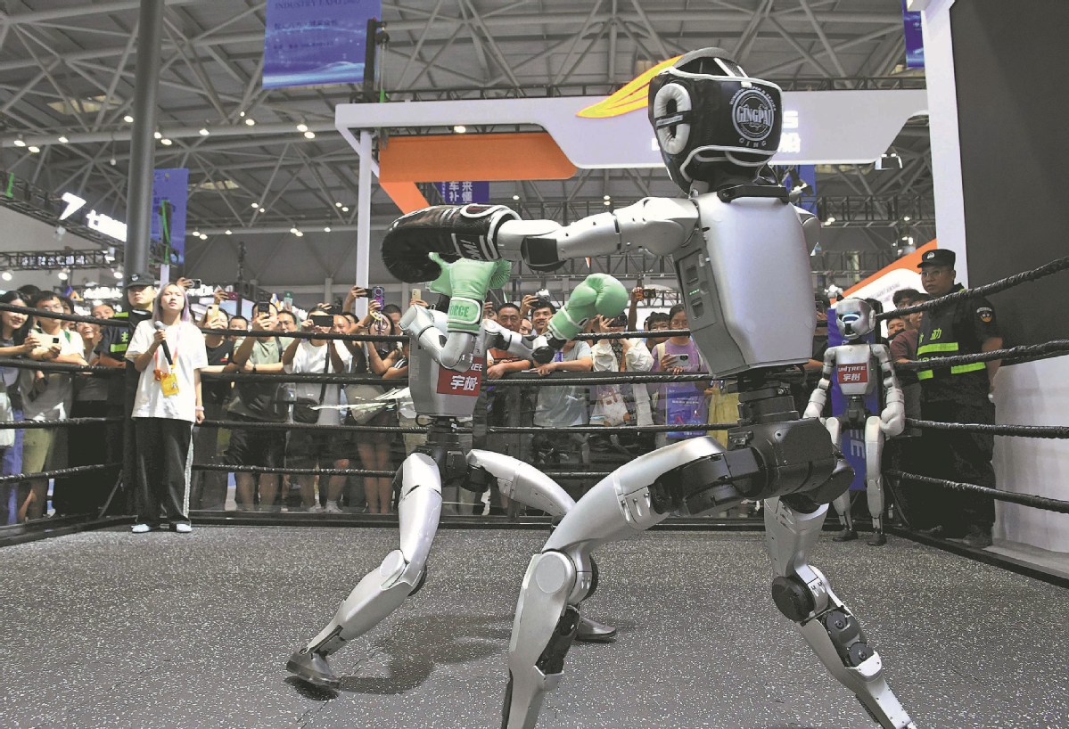 Two humanoid robots from Unitree Robotics punch their way at a boxing match, attracting a great number of spectators during the World Smart Industry Expo 2025, which opened in Chongqing on Friday. ZHOU YI/CHINA NEWS SERVICE